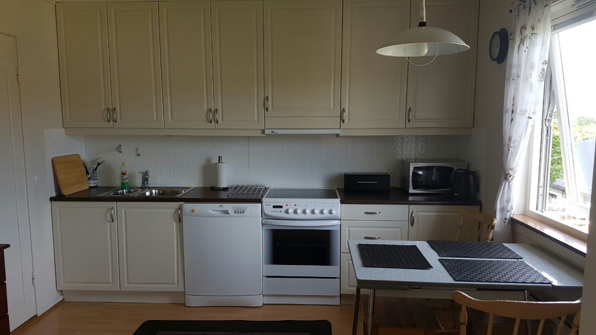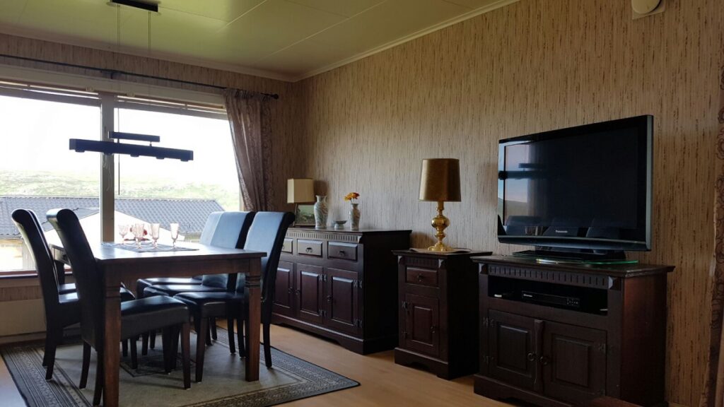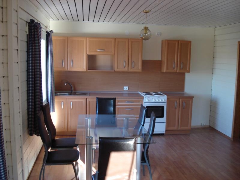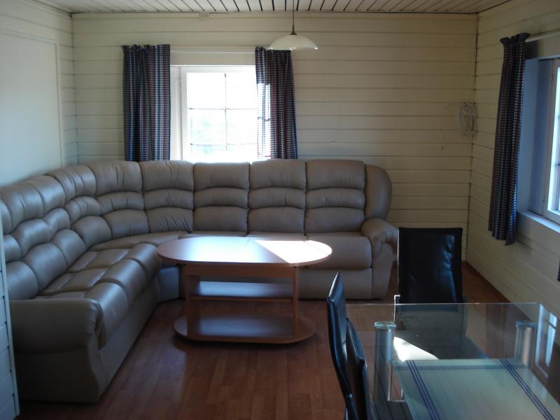 Wohnraum mit Mini-Küche. Herd (2-Platten), Backofen, Kaffeemaschine,Wasserkocher, Kühlschrank. Badezimmer mit Dusche/WC. Sitzgruppe mit Tisch. TV-Gerät, allerdings nur für DVD Betrieb geeignet. 2 Schlafzimmer mit je einem Etagenbett. Kostenloses WLAN, Gefriertruhe. Zu jeder Hütte gehört ein 19 Fuß Kvernø Alu-Boot, 60 PS, Echolot und Kartenplotter. Die Boote sind zudem mit je 2 Handgaffs und einer Heilbuttharpune ausgerüstet.